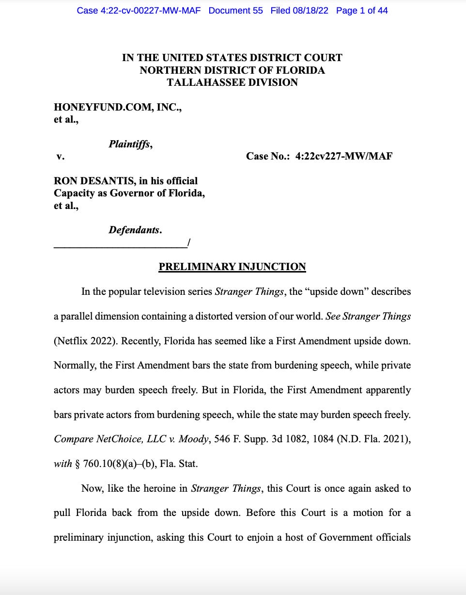 In August a federal judge issued an injunction that temporary blocked officials in Florida from enforcing the new law. The injunction (seen in part below) begins by referencing Stranger Things. A factoid that isn’t even the weirdest thing about all of this. You can read the full injunction here.
